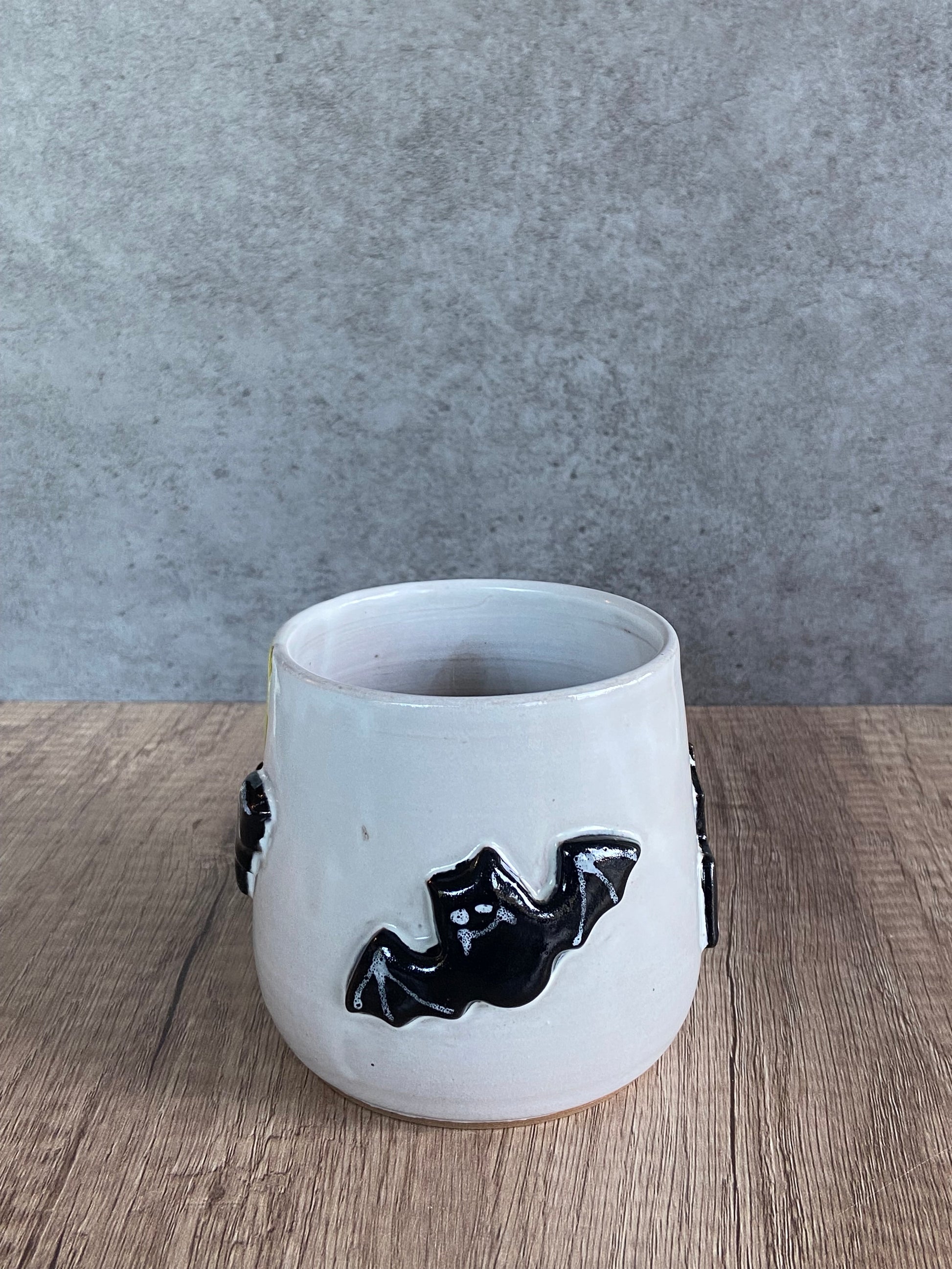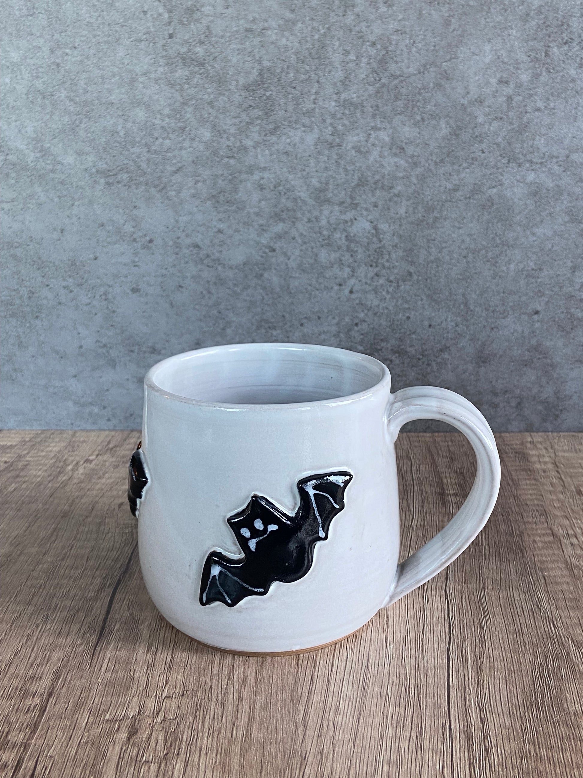 More Bats come to play. This mug features a harvest moon as well. 15oz capacity. Made with love and walnut clay. Dishwasher and microwave safe.