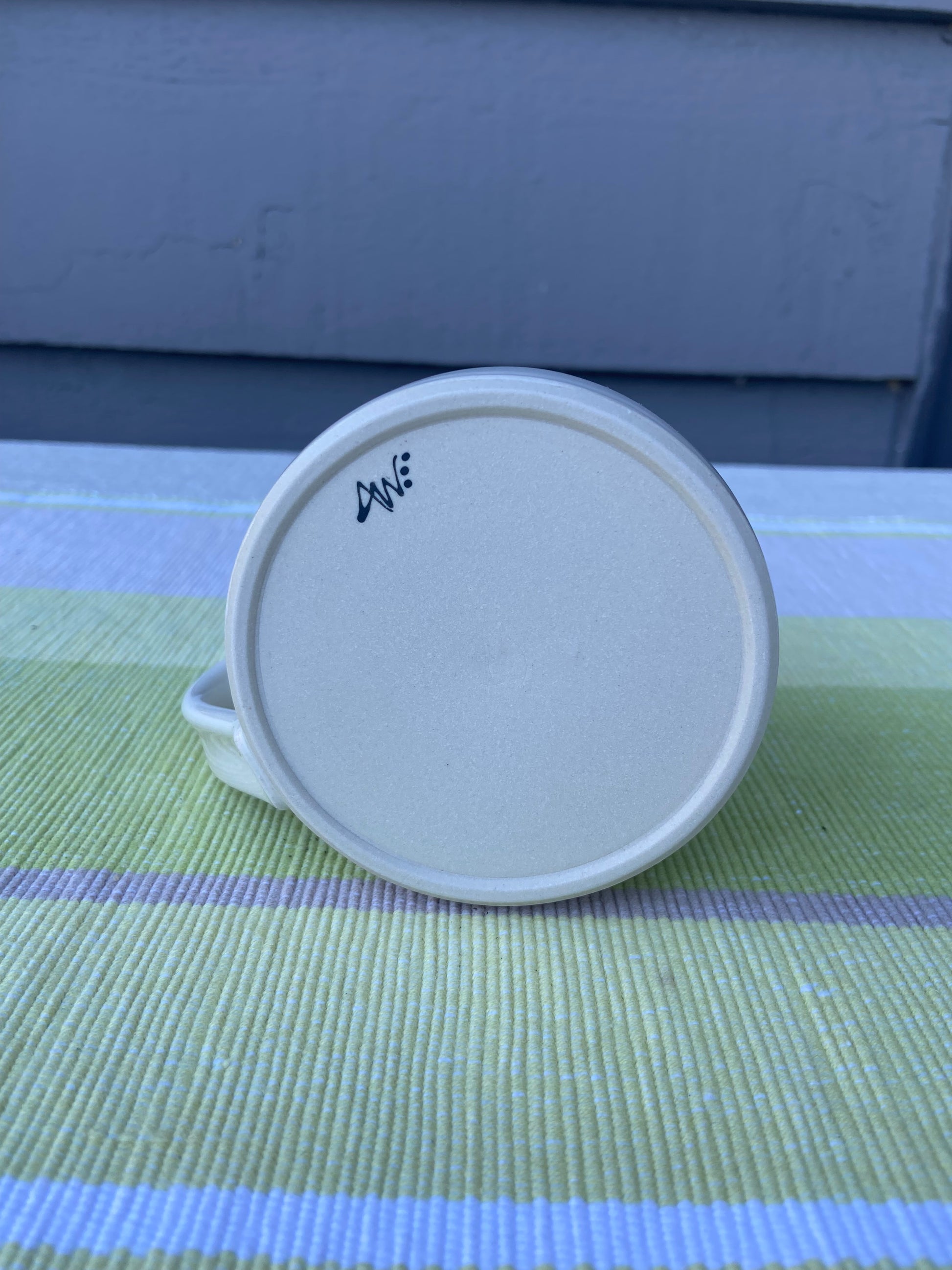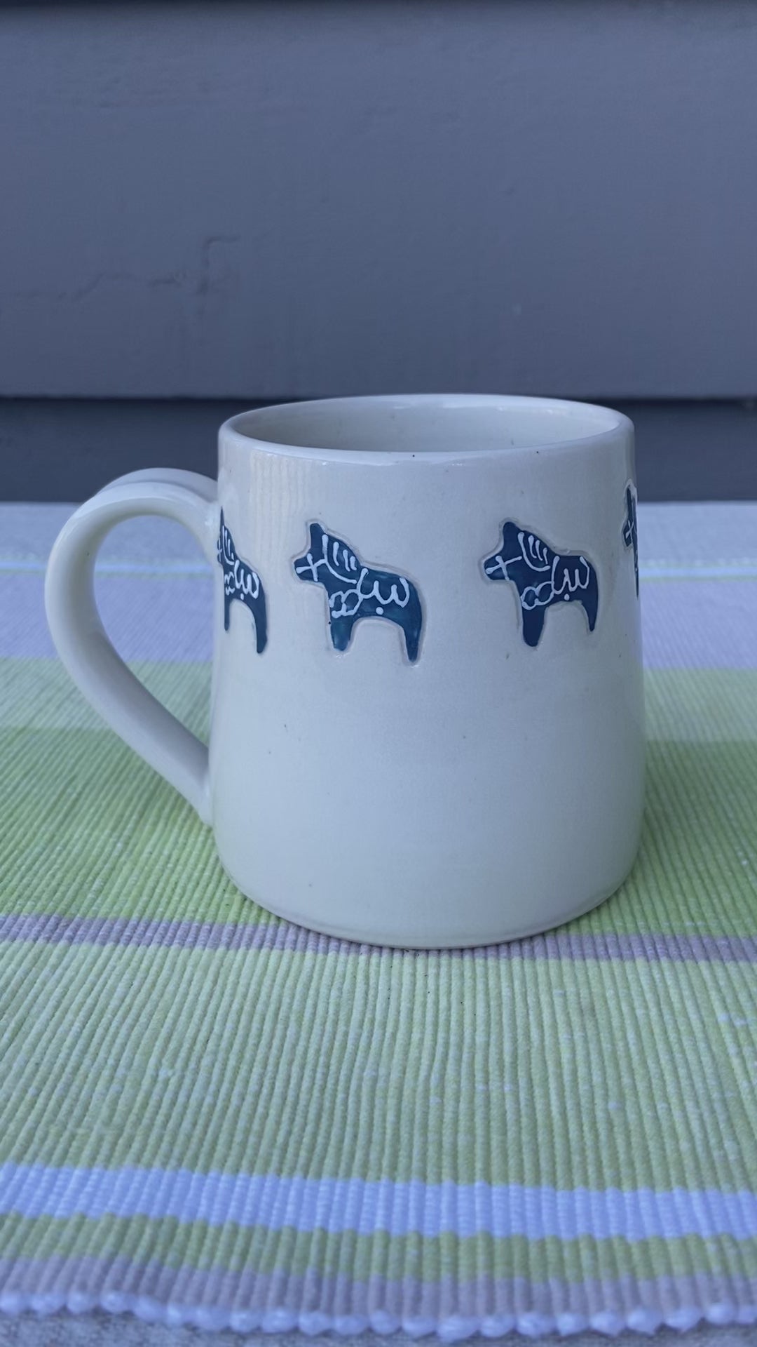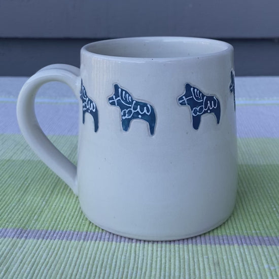 Cream glazed mug with blue un-glazed dala horses on the exterior. 12 oz capacity. Dishwasher and microwave safe.