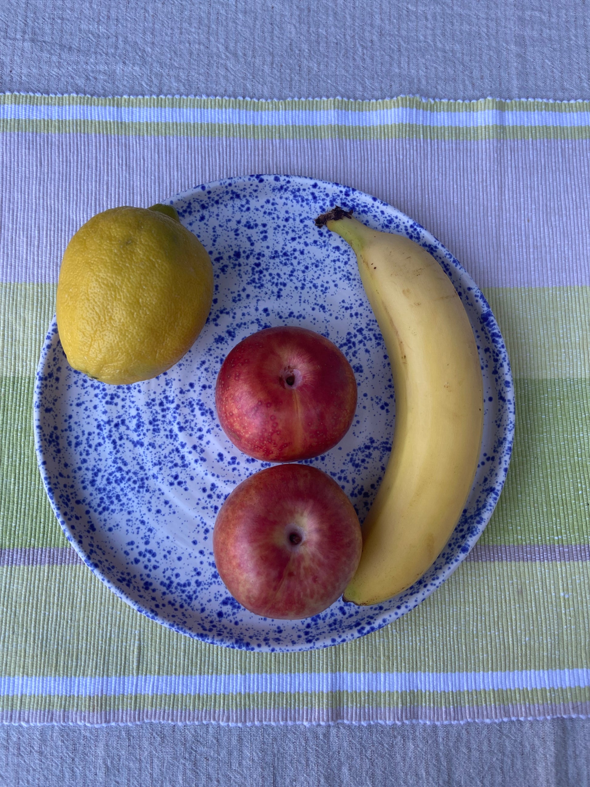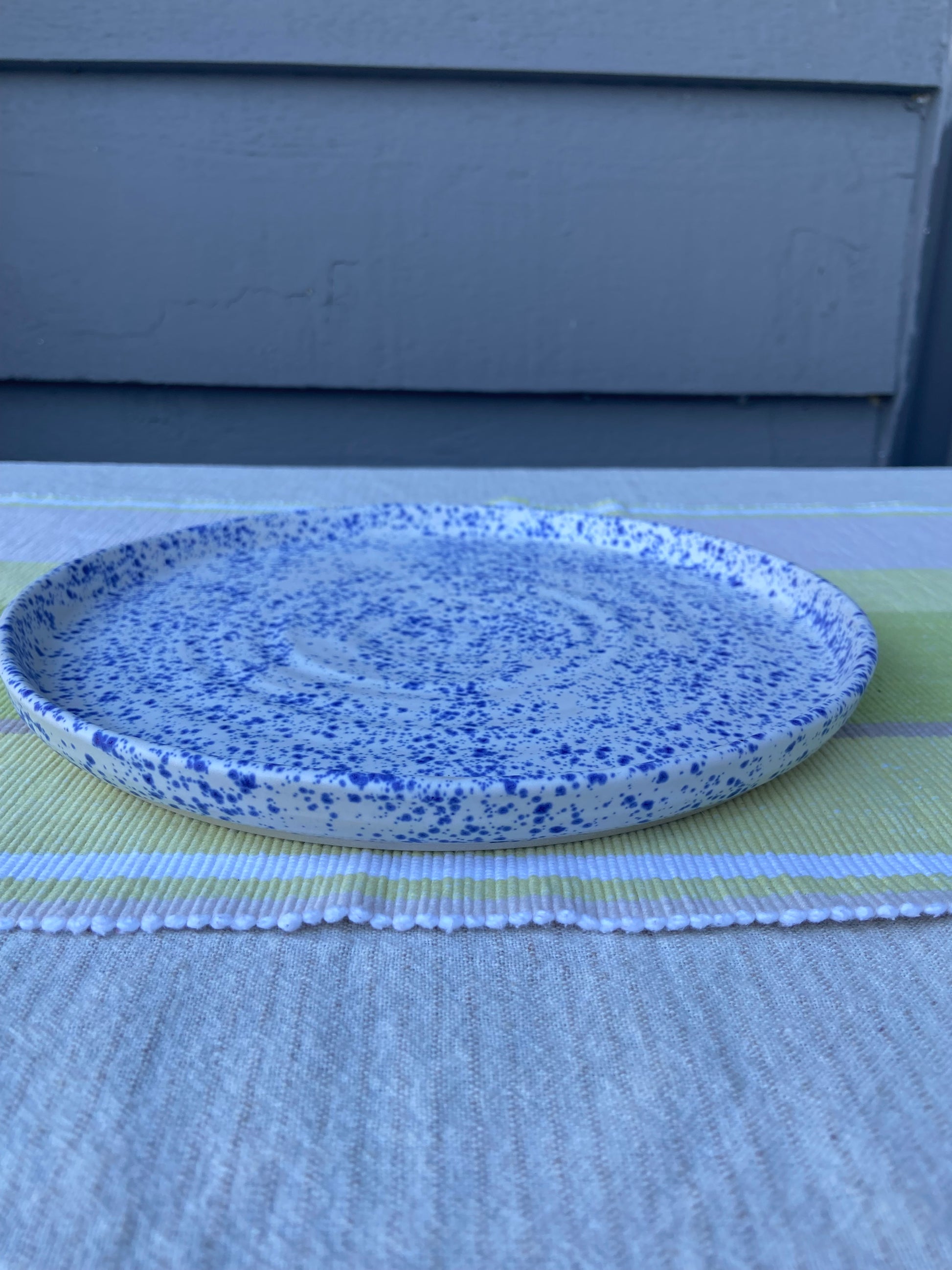 Matte white glaze with blue speckle. White stoneware clay. Diameter: 9.75in. Dishwasher and microwave safe.