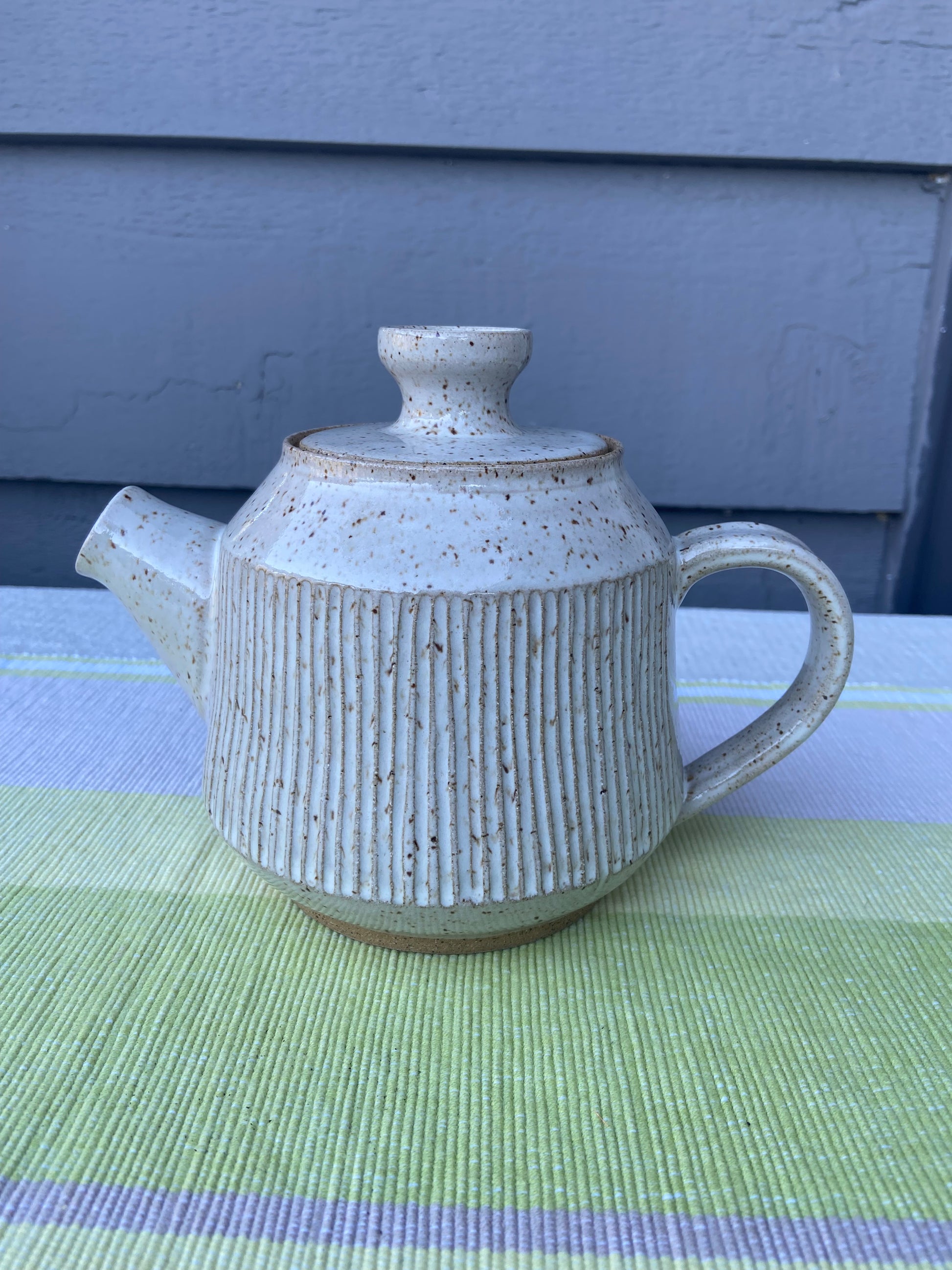 Teapot in cream glaze. Speckled buff stoneware clay. 26oz capacity. Tall interior flange on top allows for one handed pouring. Matching mug sold separately.
