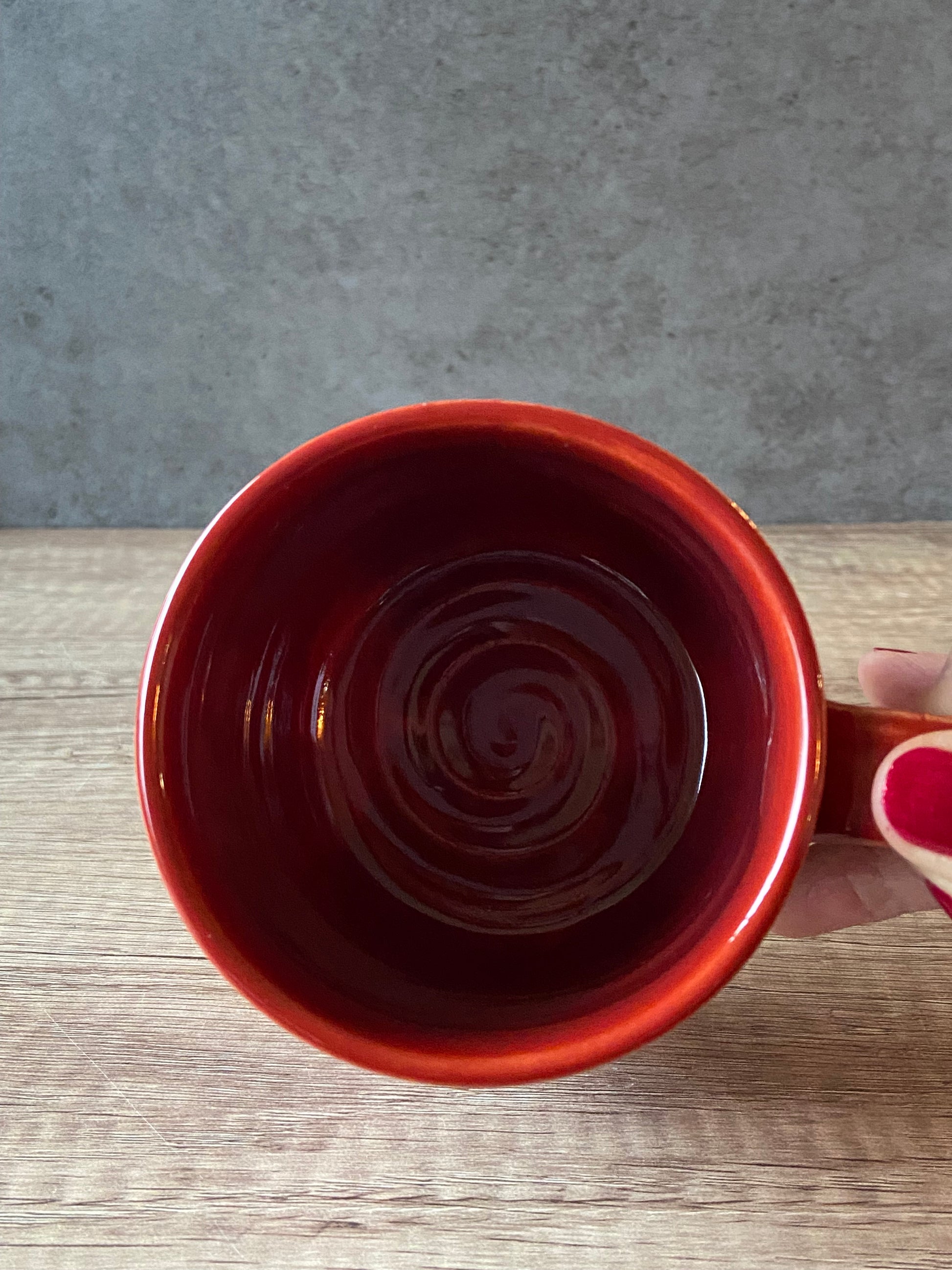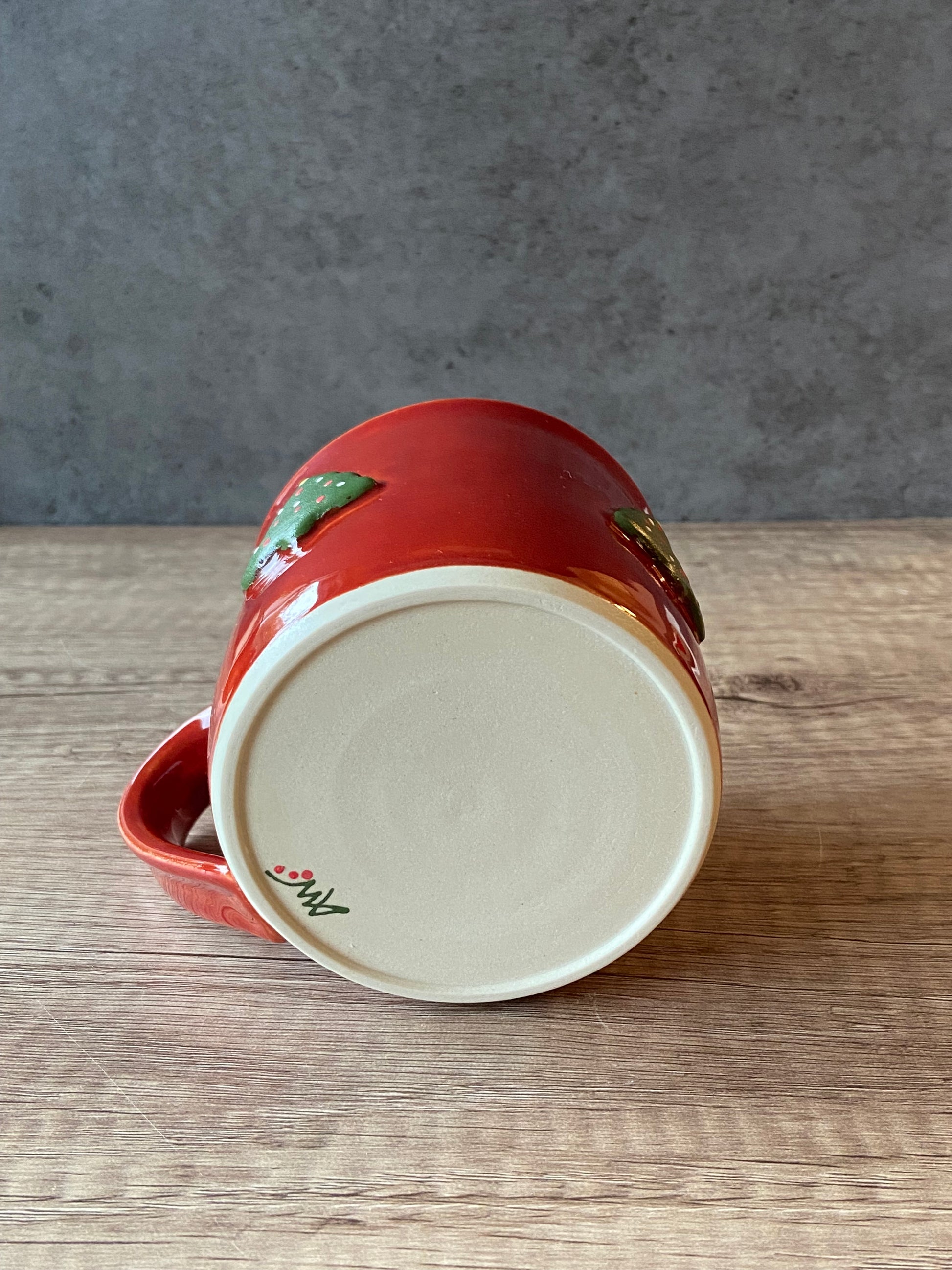 Red mug with 3 green Christmas trees. Made with white stoneware clay. 13oz capacity. Microwave and dishwasher safe.