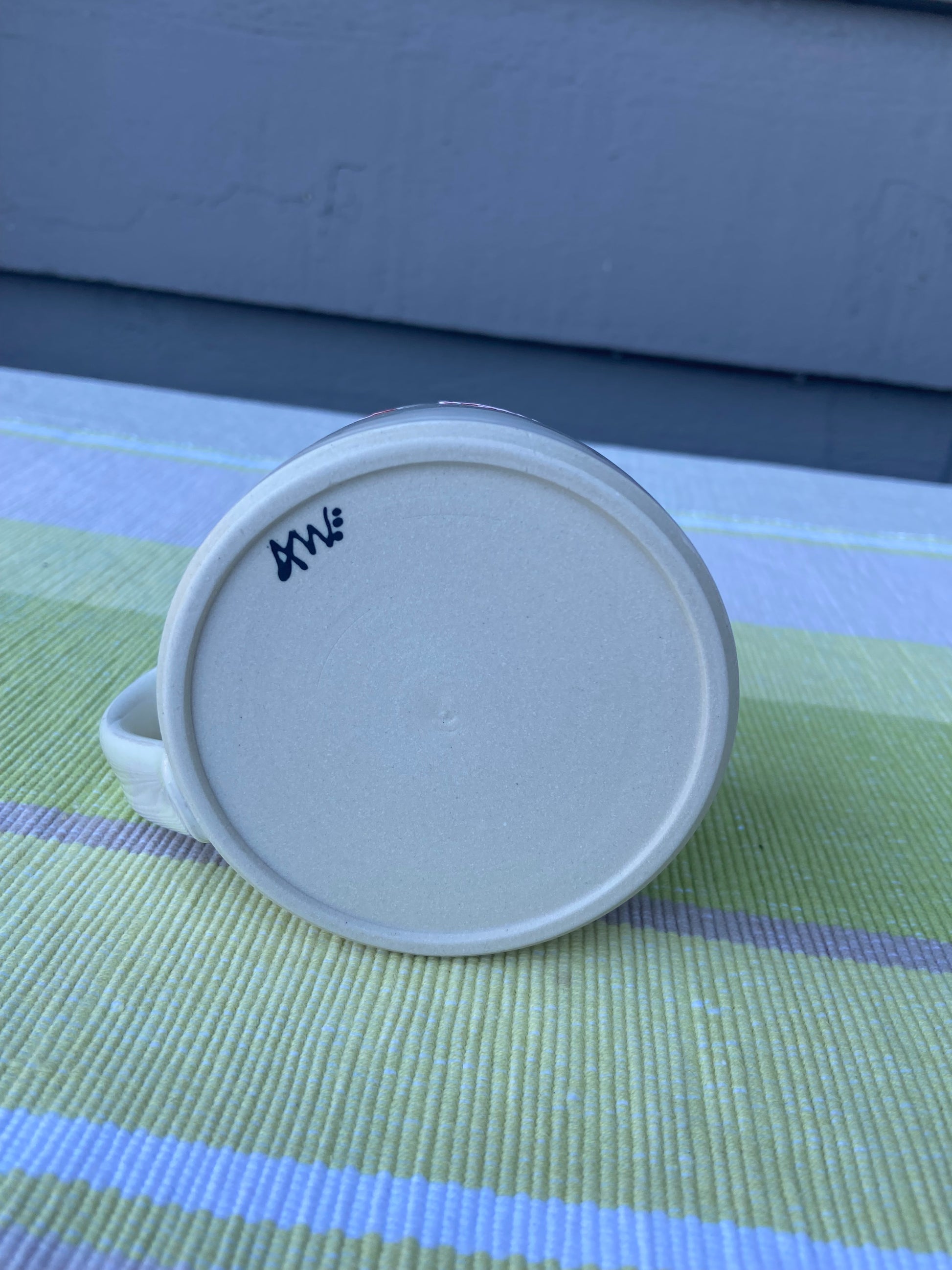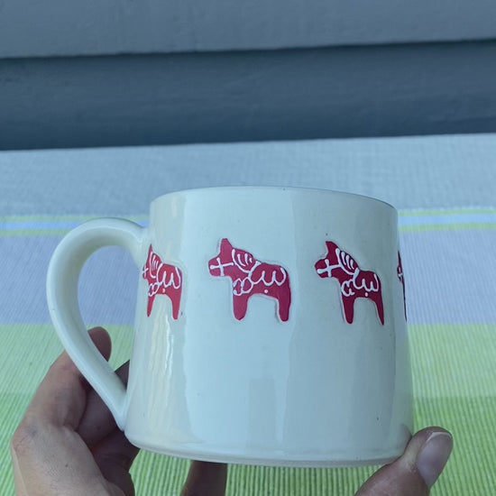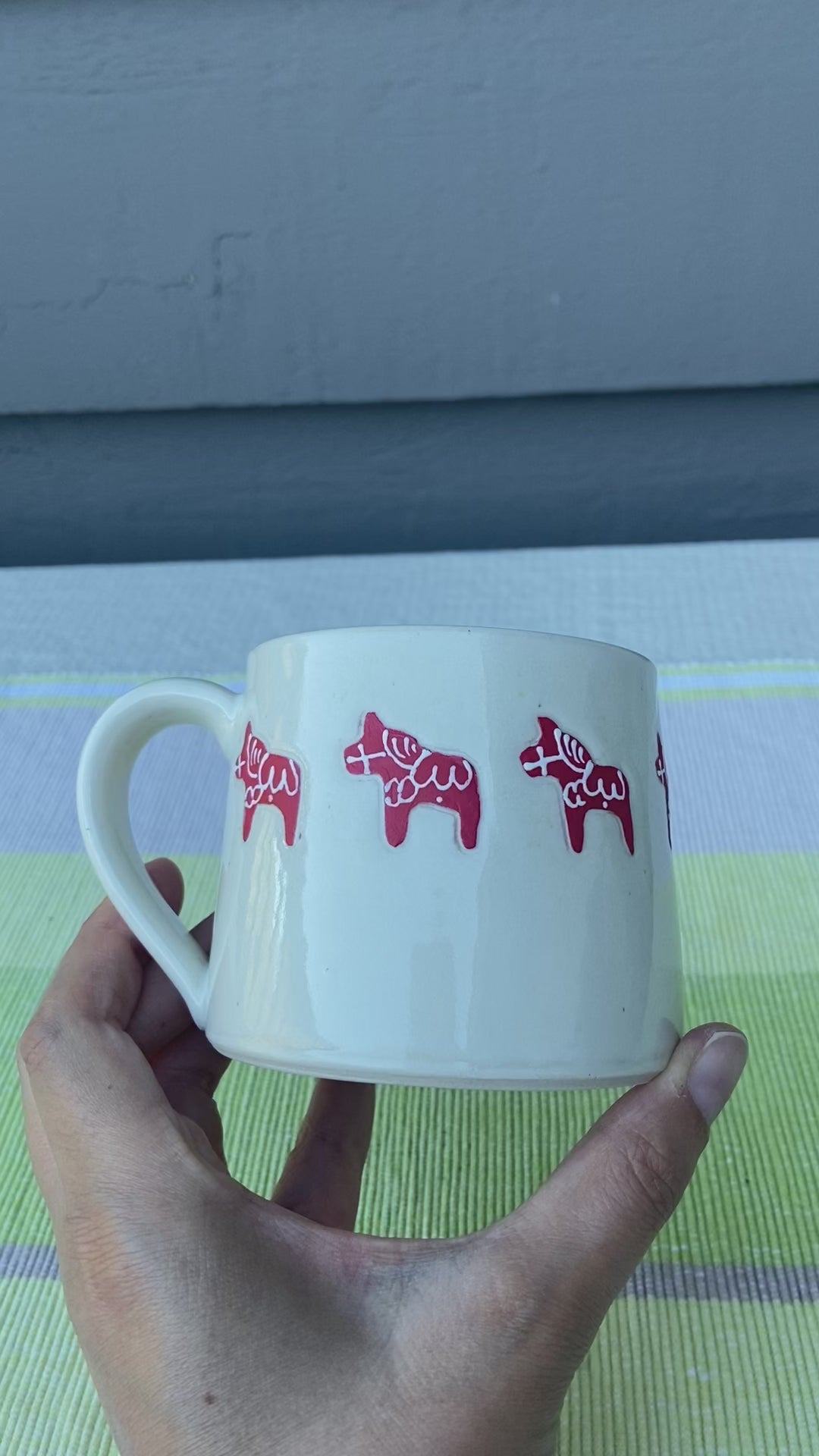 Cream glazed mug with red un-glazed dala horses on the exterior. 10 oz capacity. Dishwasher and microwave safe.