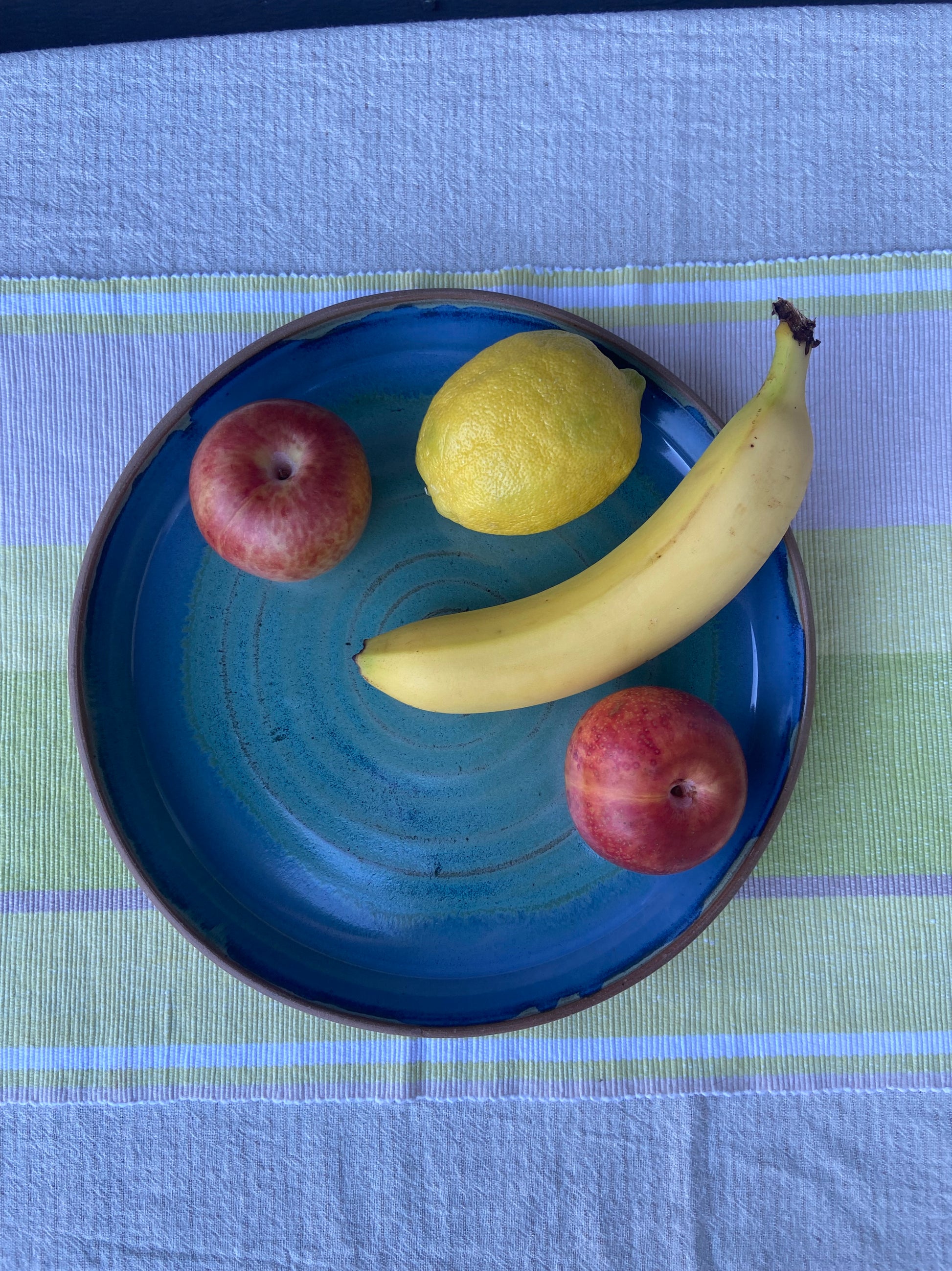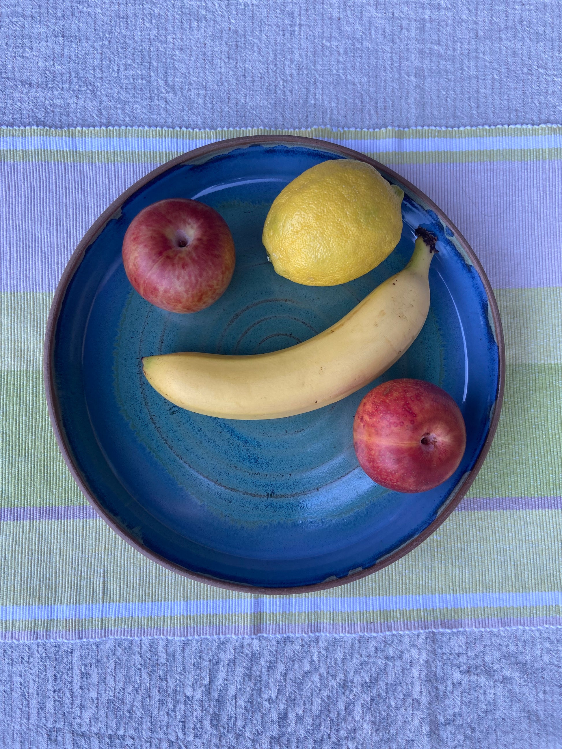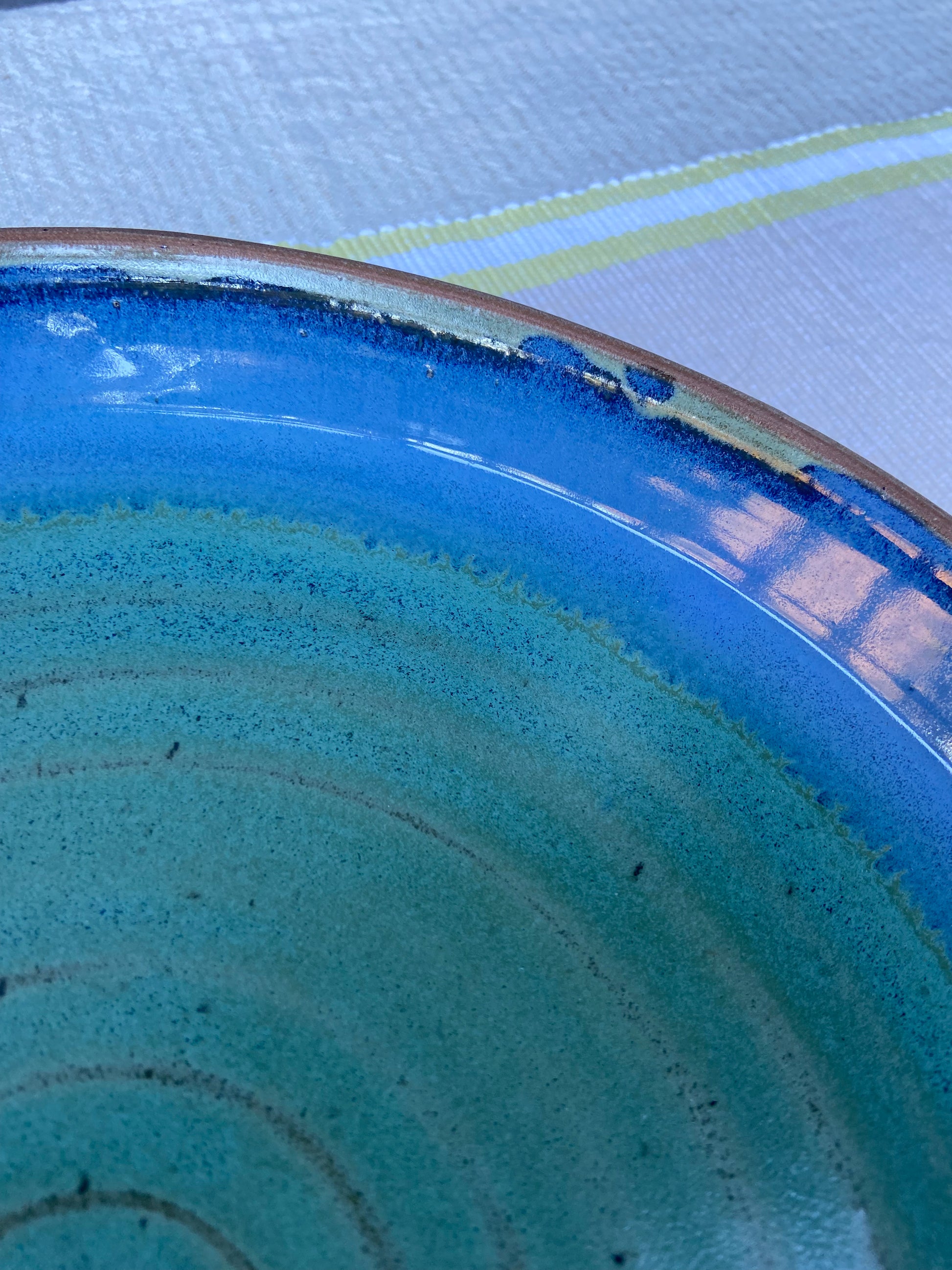 This piece has a glazed interior and raw clay exterior. Walnut brown clay. 11.25in diameter and 1.25in height. Dishwasher and microwave safe.