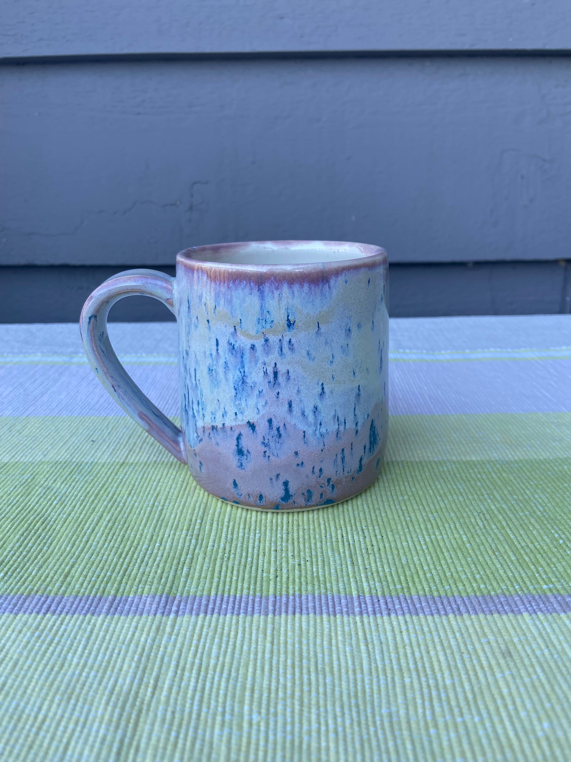 Sugar plum mist exterior and cream interior glaze. White stoneware clay. 15oz capacity. Dishwasher and microwave safe.